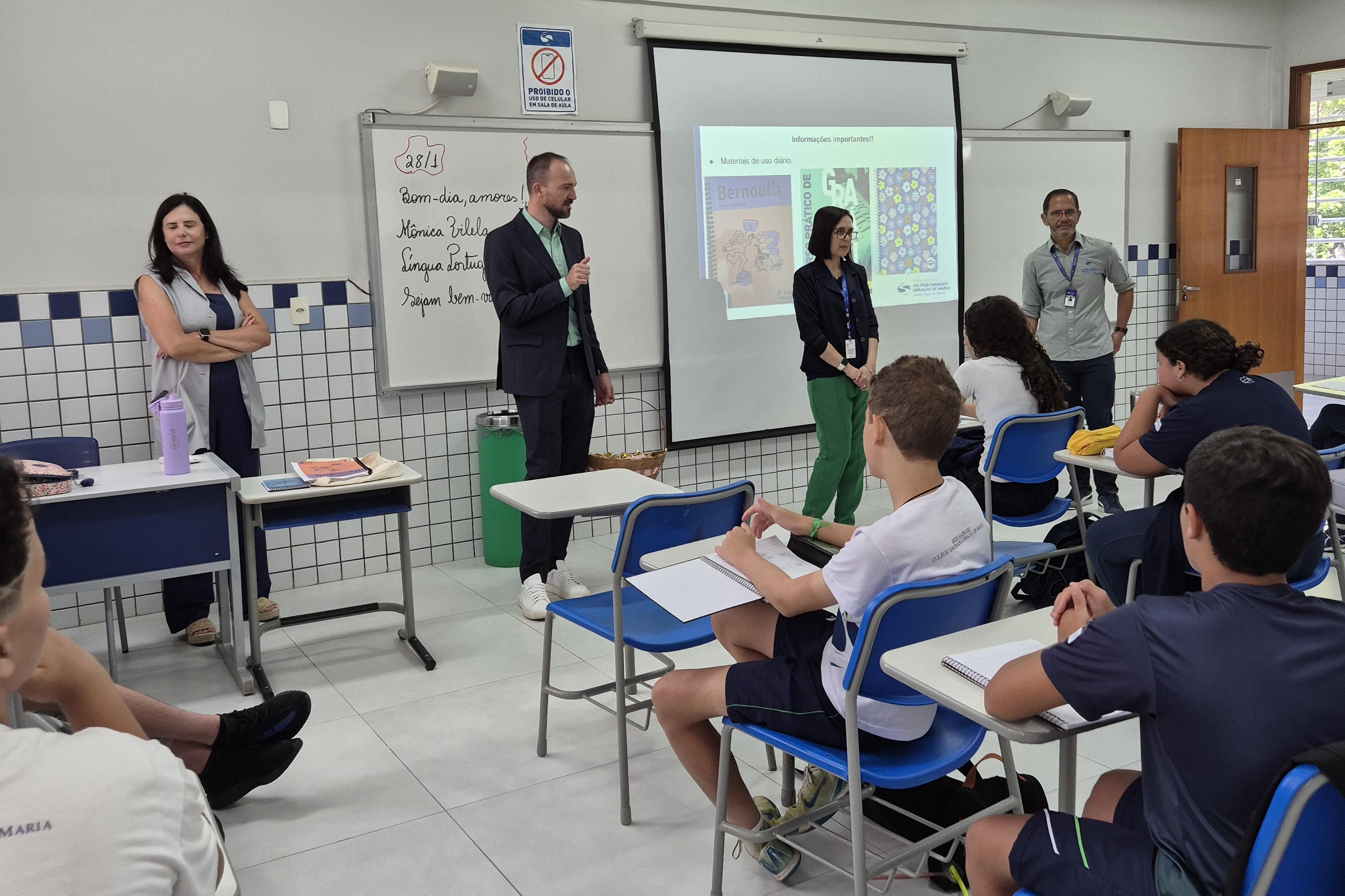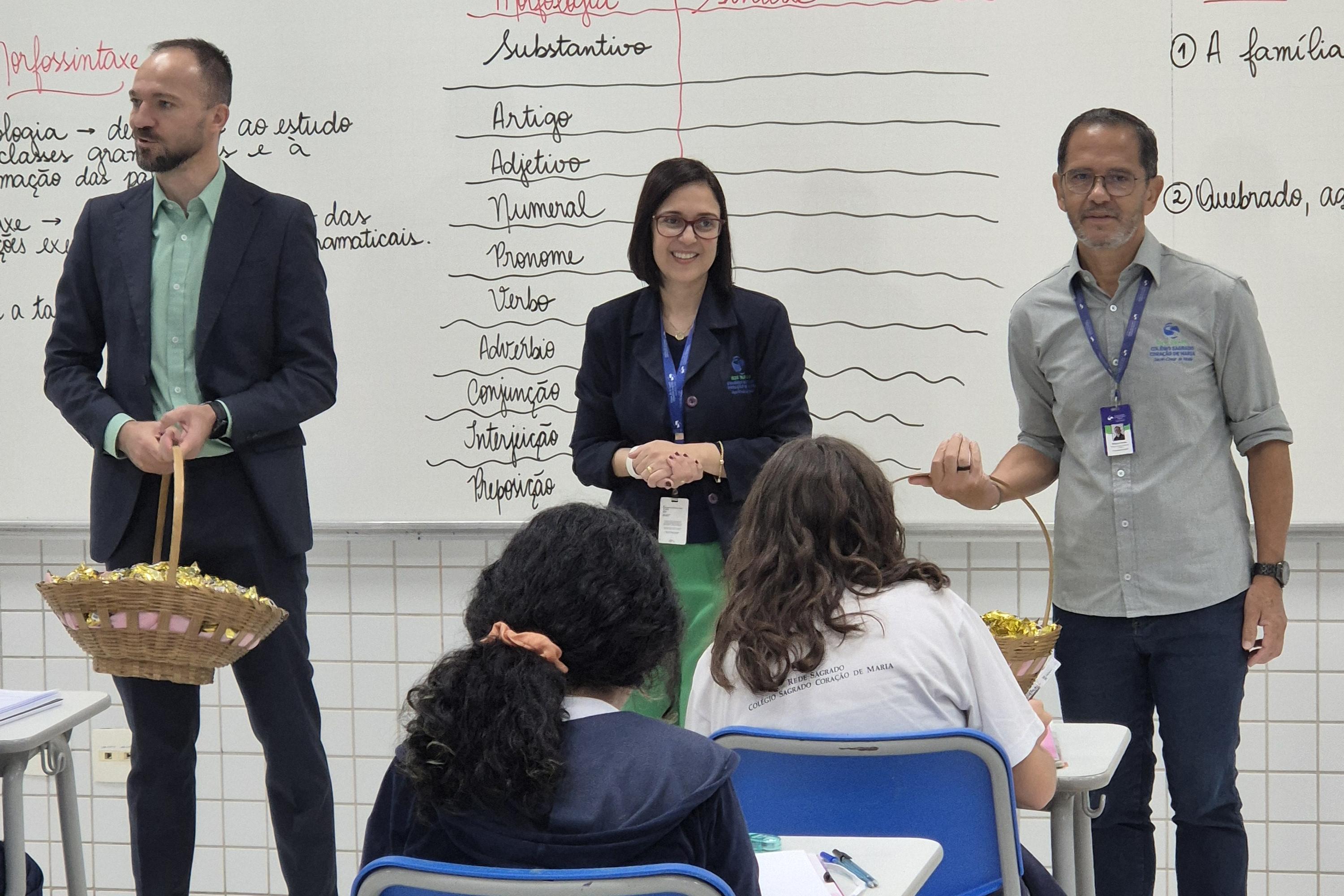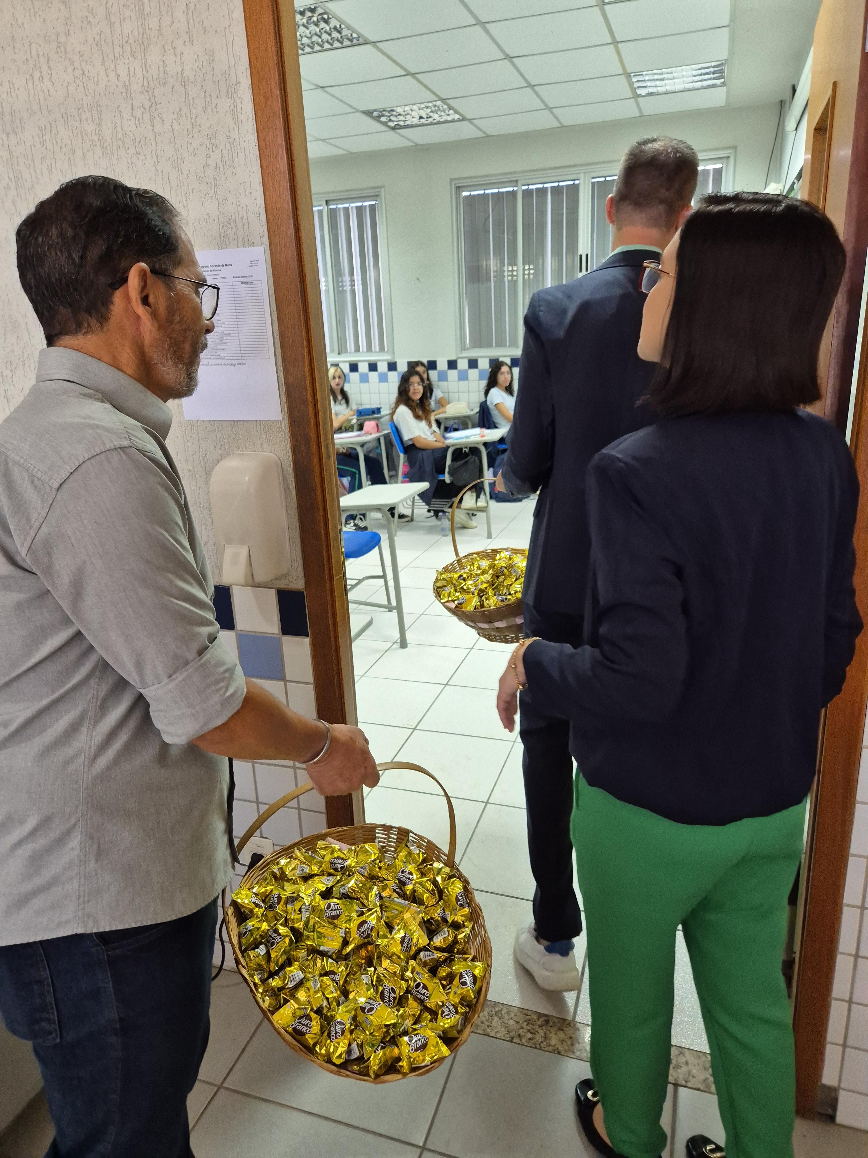 Já para os estudantes do Ensino Fundamental – Anos Finais – e do Ensino Médio, a acolhida aconteceu em sala de aula, com a presença da gestão da escola: o diretor Edenilson, o coordenador do Núcleo de Pastoralidade, Ir. Sério, e a coordenadora pedagógica geral, Rosangela. Na ocasião, os gestores acolheram os estudantes, conversaram sobre as expectativas para o ano letivo, deram as boas-vindas e finalizaram o momento com a entrega de um chocolate.