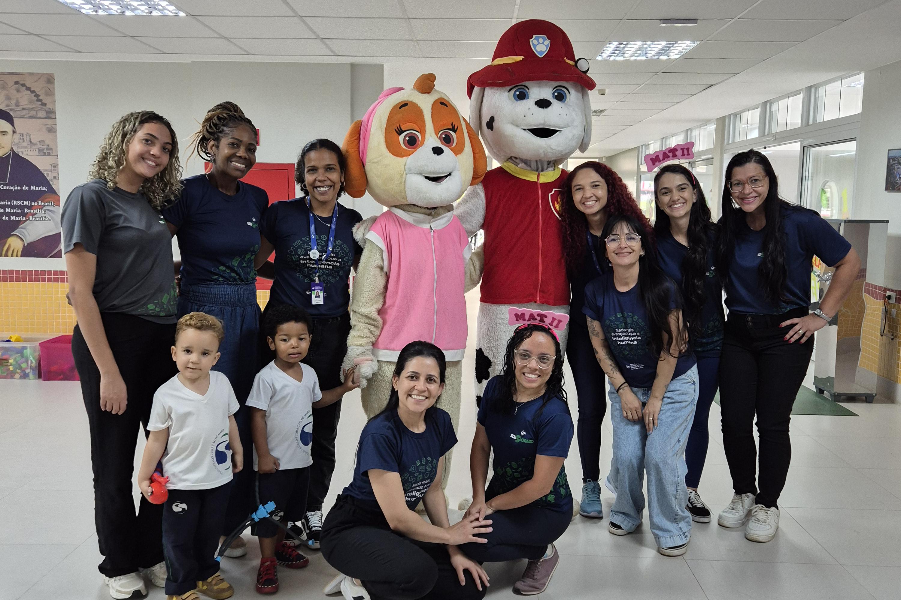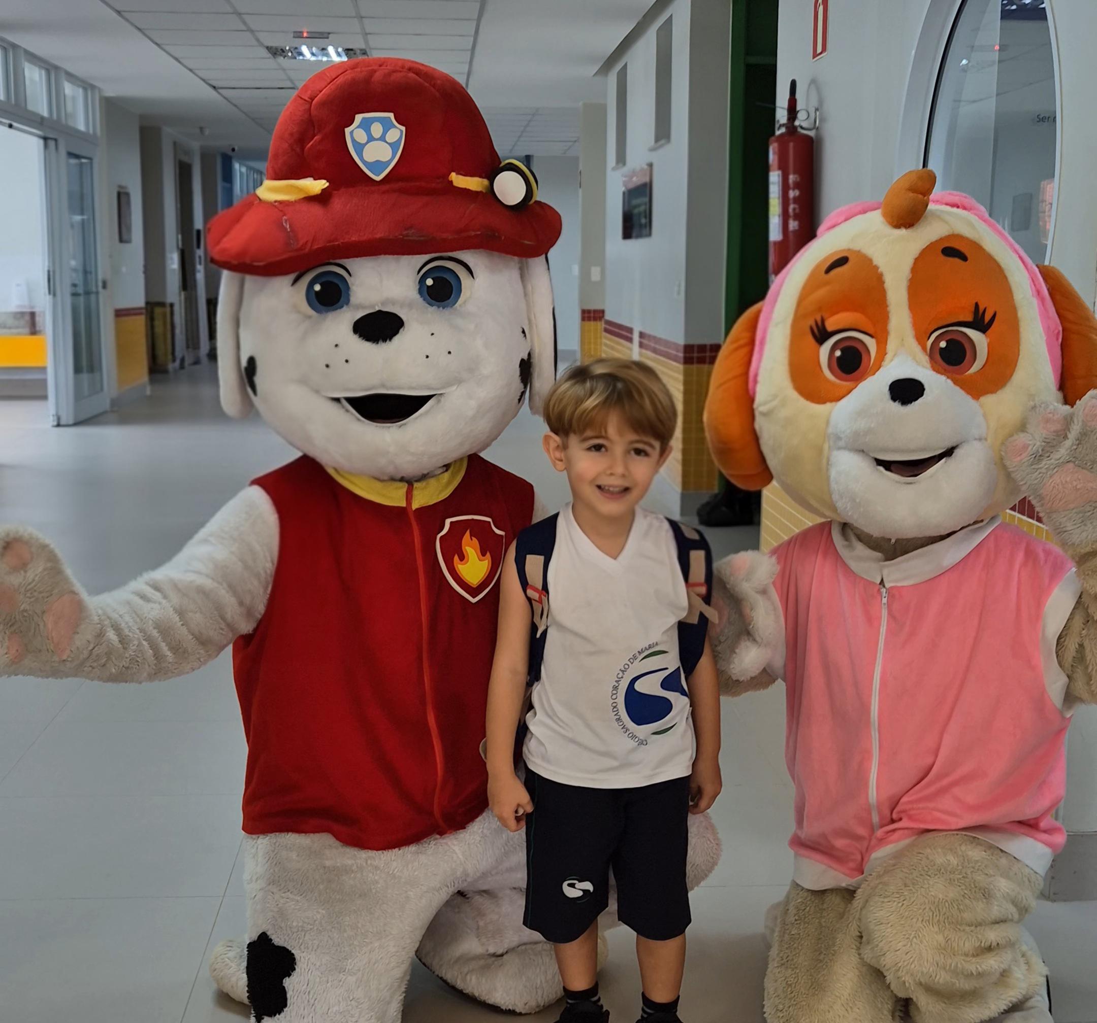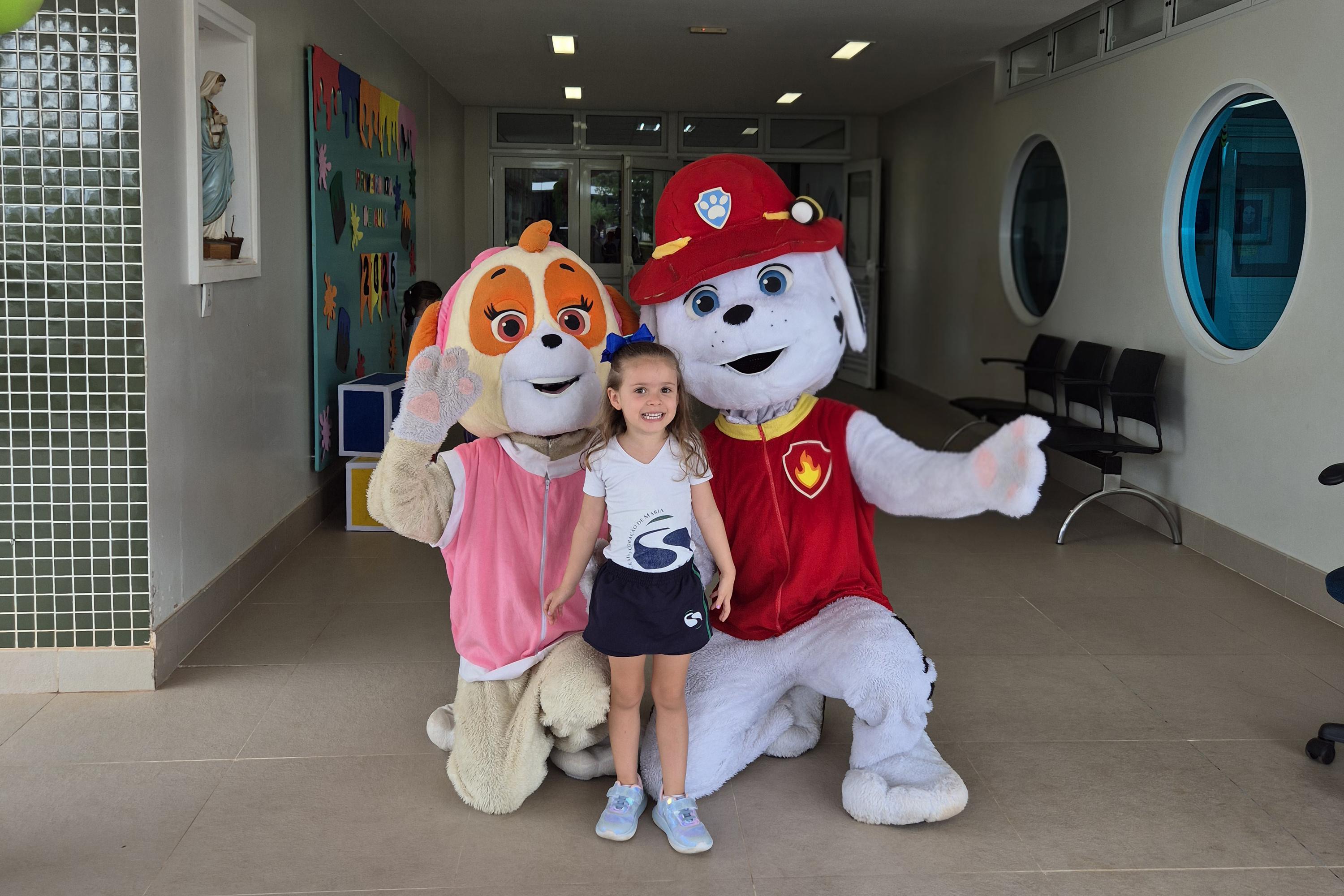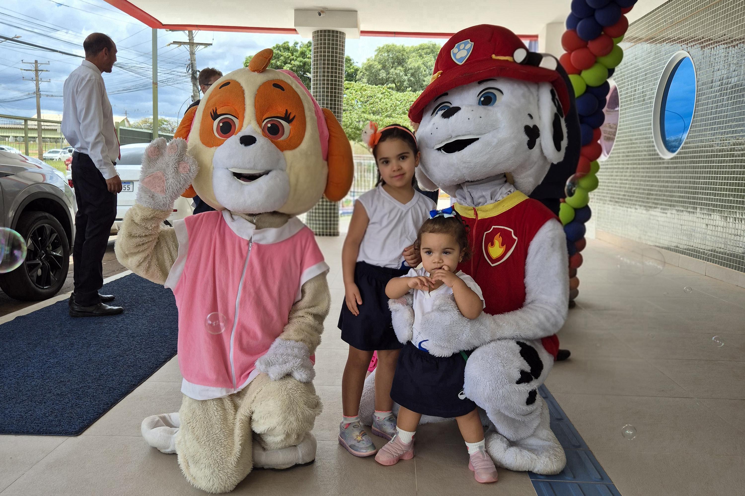 Na Educação Infantil, a chegada das crianças contou com a presença dos personagens Skye e Marshall, da Patrulha Canina.